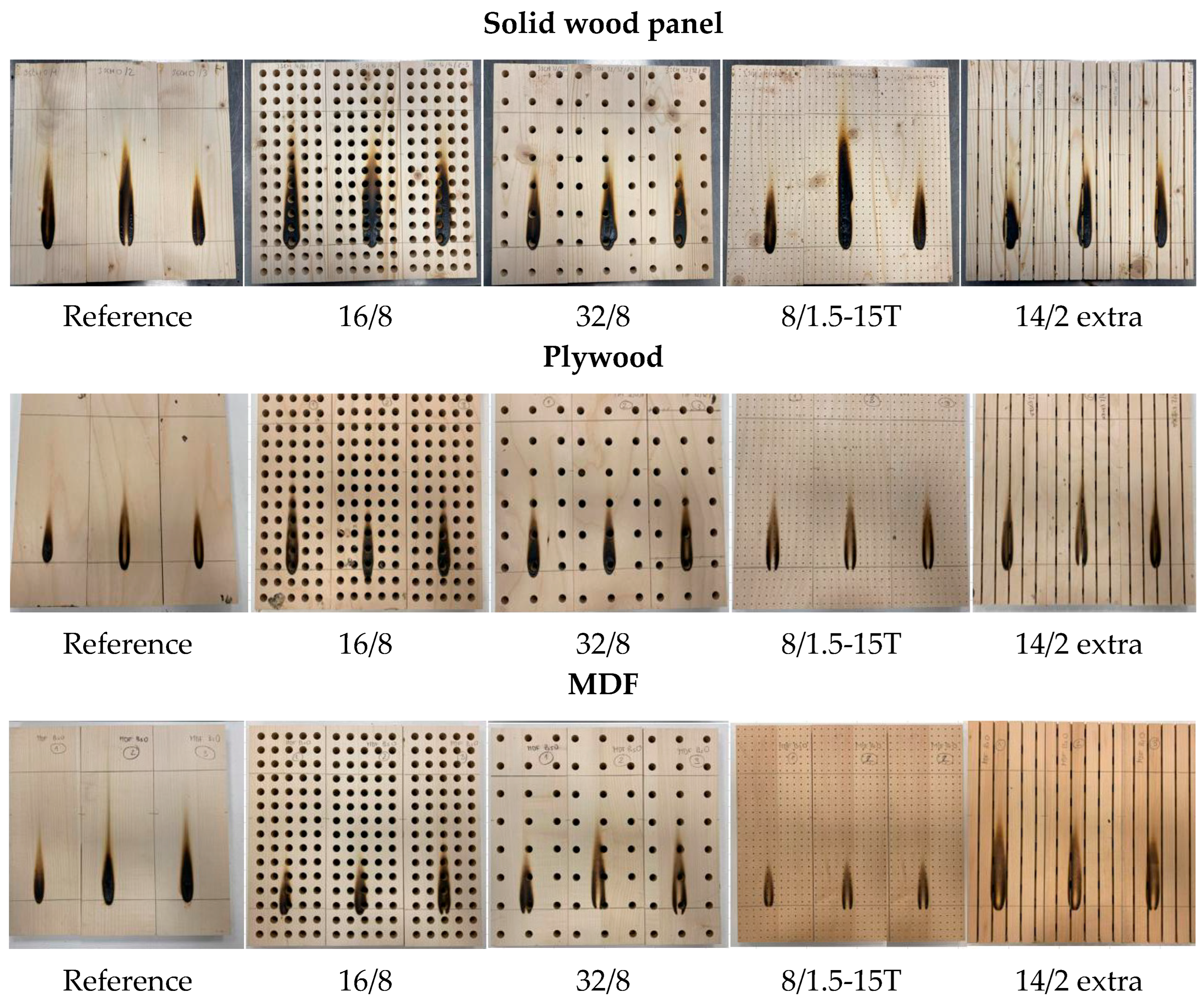 - Frangi, A.; Fontana, M.; Schleifer, V. Fire Behaviour of Timber Surfaces with Perforations. Fire Mater. 2005, 29, 127–146. [Google Scholar] [CrossRef]