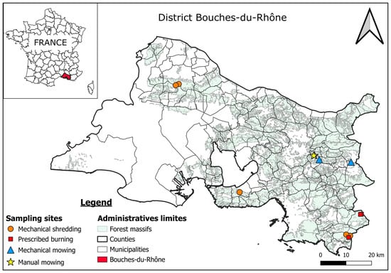 The four methods of fuel treatment selected in this work were among the most frequently used in southeastern France [27]. Two of these methods targeted woody vegetation (in this case, Quercus coccifera shrubland growing under Pinus halepensis stands) in forested lands, prescribed burning (PB) and mechanical shredding (MS), which consists of using machines equipped with hammer mills to shred and crush vegetation into finer pieces. For roadside grass treatment, we took into account manual mowing with a string weeder (SW) (on grass composed of 95% Oloptum miliaceum mixed with Dactilis glomerata) and mechanical mowing using a tractor equipped with a roadside mower (on grass composed of 100% Bromus erectus). The former can be implemented in both WUIs and WNIs, while the latter is only used along roadsides. Mowing results in the production of residues that are left in situ, but we also tested a modality without residues for the mechanical mowing method for comparison (MMR vs. MMwR). The goal of the study was not to compare treatments with each other, but to compare treated vegetation to a control, so the possible difference in vegetation composition between treatments was not an issue. The samples were collected during summer in 2023 and 2024 in four forested lands or along roadsides in the district of Bouches-du-Rhône (southeastern France; Figure 1; Table A1 and Table A2). In this district, a fuel treatment policy has been implemented since 1985 and was reinforced in 2001. This study area is characterized by a Mediterranean climate, with hot and dry summers (500 to 700 mm of annual rainfall; https://meteo.data.gouv.fr/ accessed on 30 January 2026), often windy, and is mainly covered by shrublands as well as by more or less dense forest stands (dominated by Aleppo pine (Pinus halepensis)), highly conducive to fire. The district is also densely populated, with a large proportion of its population living at the WUI. The WUI surface area represents less than 30% of that of the district but is affected by ~50% of the fire ignitions, while communications networks altogether are responsible for more than 80% of the ignitions [5].