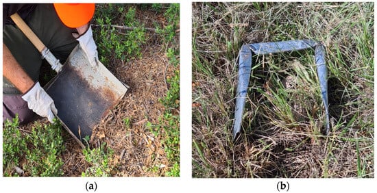 Different sampling protocols depending on the type of vegetation, (a) for woody vegetation, using a metallic large flat shovel, and (b) the metal template used to delimit the grass samples.