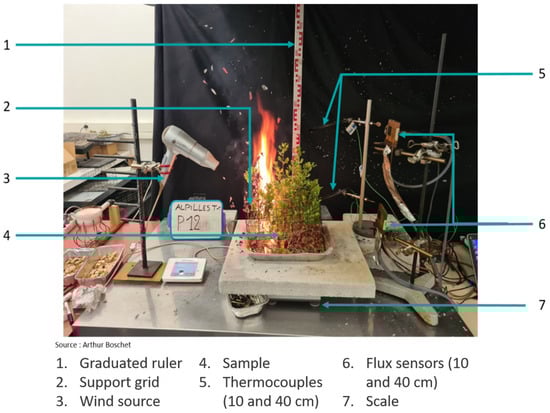 The set-up of the experimental bench and the burning protocols were derived from those used in previous studies [19,20,21,22,29,30,31] (Figure 3). Our burning bench was composed of a weighing scale (Model XSR10002S, Mettler Toledo GmbH lm Langacher 44 8606 Greifensee Switzerland) supporting a plate made of cellular concrete onto which the samples were put for recording the mass loss; two flux sensors (located at 20 cm from the sample) and two type K 0.25 mm (Chromel/Alumel) thermocouples (located above the centre of the sample), were both positioned at 10 and 40 cm high and linked to a data logger (ALEMO 2590 Ahlborn, Ahlborn Messund Regelungstechnik GmbH) for recording the variation in heat flux and temperature over time. An airflow source (fan) was placed at 70 cm and inclined at 45° from the sample (only used when testing ignitability), and a camera, located at 1.10 m in front of the burning bench, was used to film the burning experiments. Finally, a graduated ruler was located behind the sample to allow for measuring flame height.