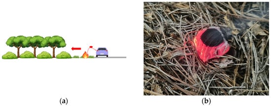 The ignition protocol (a) Schematisation of the simulated ignition by a cigarette butt thrown from a car on the roadside (the arrow indicates the direction of fire spread). (b) Picture of a glowing firebrand used as ignition source during ignition tests.