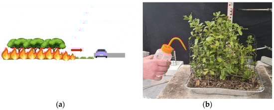 The propagation protocol (a) Schematisation of the simulated fire front coming from the forest and reaching the treated area on the roadside (the arrow indicates the direction of fire spread). (b) Picture of the calibrated alcohol line laid across the width of the tray used to trigger ignition.