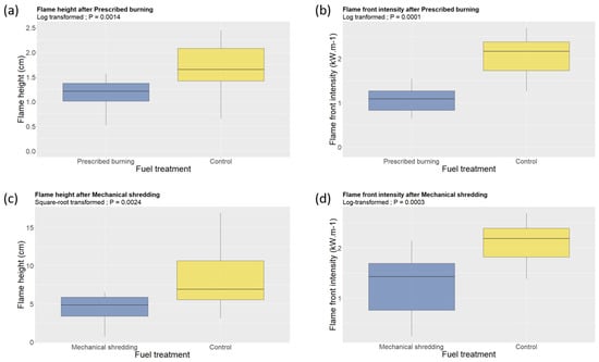 Boxplots illustrating the effects of prescribed burning (a,b) and mechanical shredding (c,d) on flame height and flame front intensity.