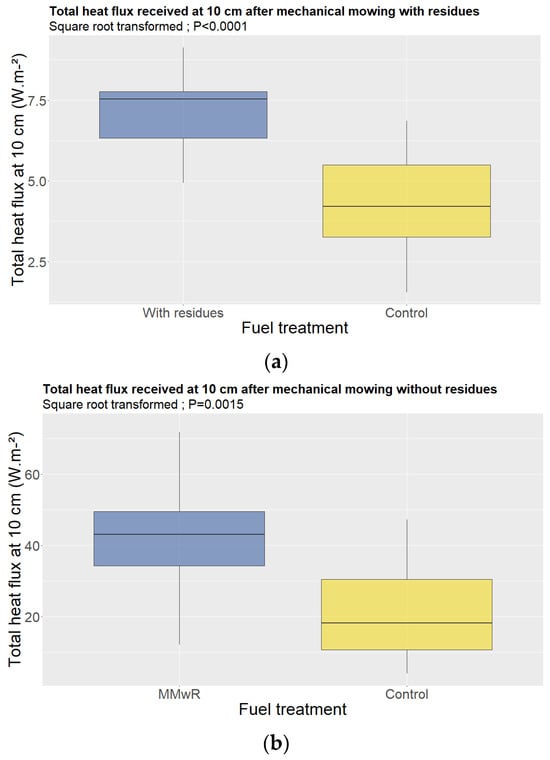 Regarding mechanical mowing without residues (MMwR), once again, ignition frequency was significantly higher in the treated vegetation than in the control (67.5% against 1.6%, respectively; KW = 49.0268, p < 0.0001), along with flame spread (KW = 8.31061, p = 0.004), maximum temperature at 10 cm (F = 4.78, p = 0.0393), total heat flux received at 10 cm (F = 12.56, p = 0.0015), and rate of spread (F = 12.98, p = 0.0014). In contrast, consumed biomass was significantly reduced (F = 5.44, p = 0.026). The treatment did not affect the other variables (time-to-ignition, flame duration, flame height, maximum temperature at 40 cm, and flame front intensity; p > 0.05) (Figure 7b).