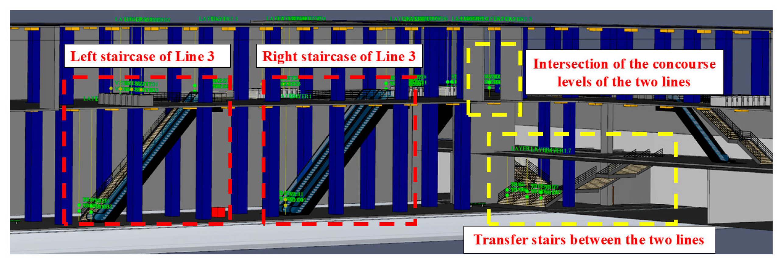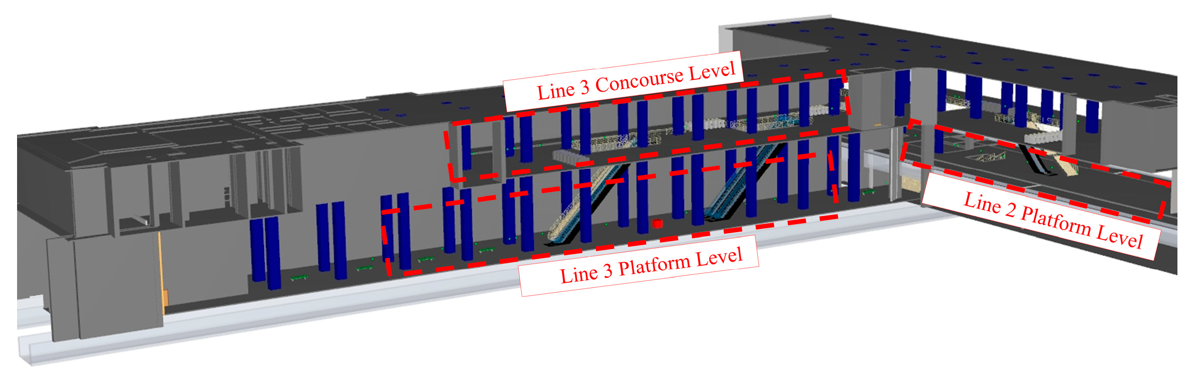- Yang, Z.; Deng, L.; Kong, L. Research on fire simulation and safe evacuation in subway stations based on BIM. J. Guangxi Univ. Sci. Technol. 2022, 33, 23–30. Available online: https://kns.cnki.net/kcms2/article/abstract?v=Ap1IM-J3Ck2W-WNViiihlsJCK6MNshhSC8VL1FXBKZgG9MbFjEa7AJ_rxTiHzaqEz53SfK5otOlIl_tFJwPx0joG7ySrjJURx2l_UGj-mNsxM1J2EdE5D8g2BD29aWrFv93y5wBH5tX8D3-A8RvZGsreH_fosbnpYjcoC3ZnAD8=&uniplatform=NZKPT (accessed on 16 August 2025). (In Chinese)