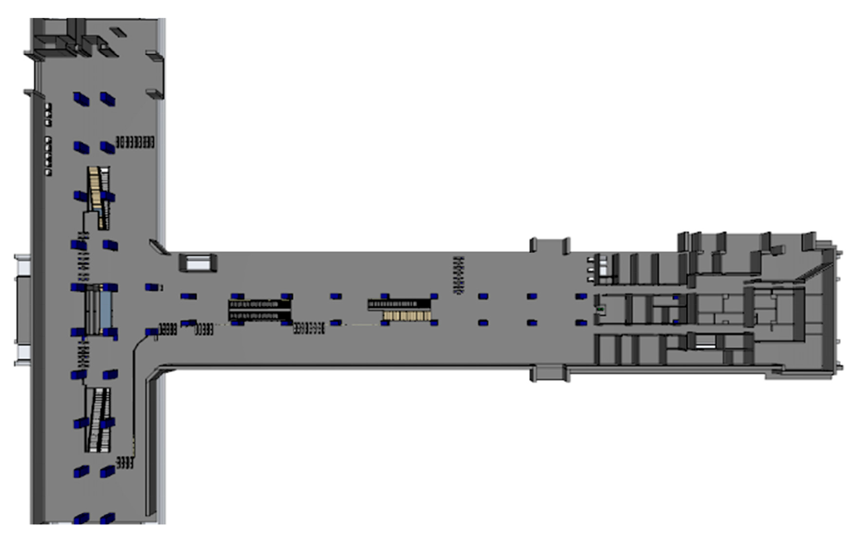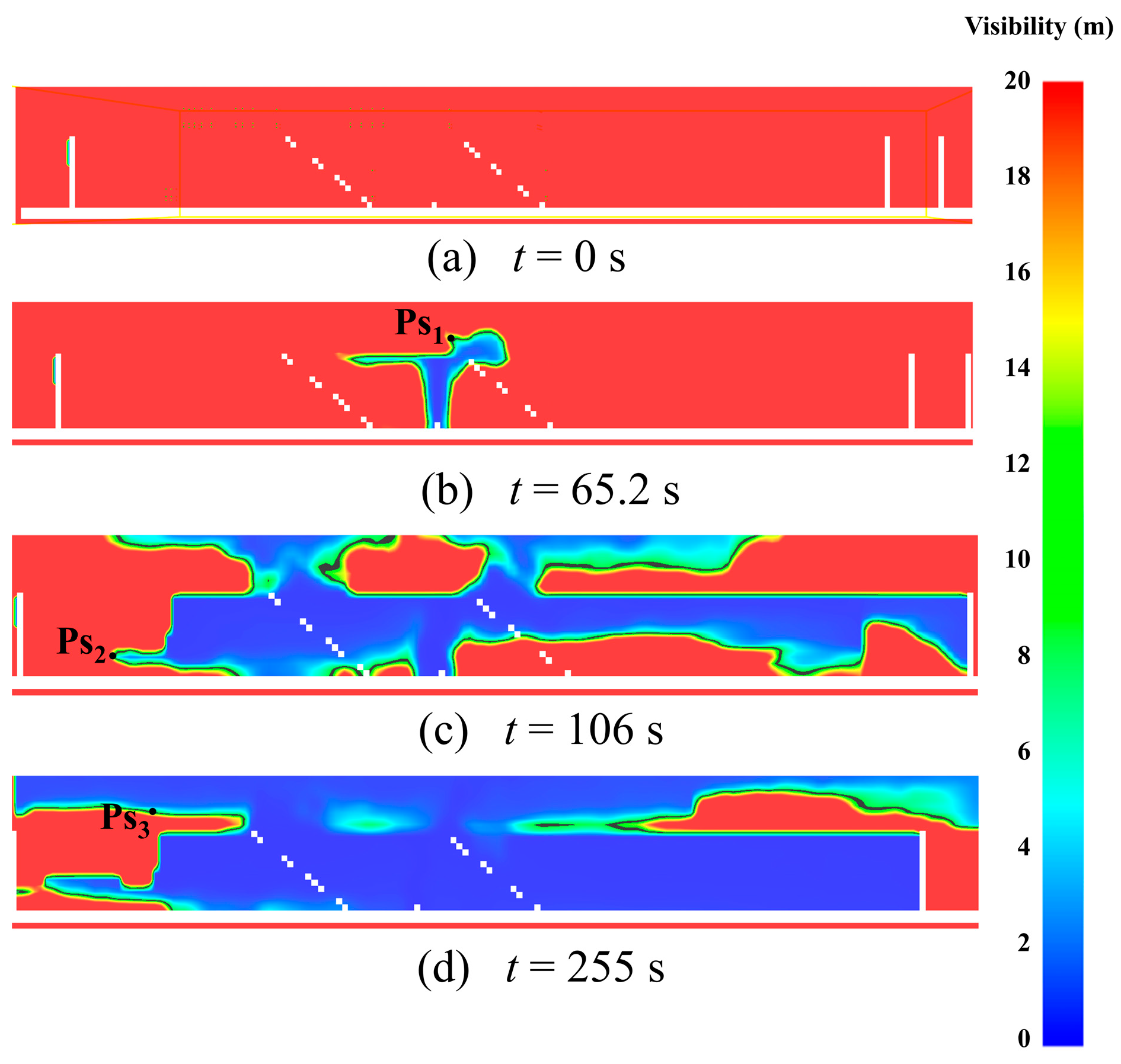 - Critical Visibility: With an initial visibility of 30.0 m, a conservative threshold of 10.0 m at a height of 1.6 m was adopted as the evacuation safety criterion, referencing critical values for both small and large spaces [25].