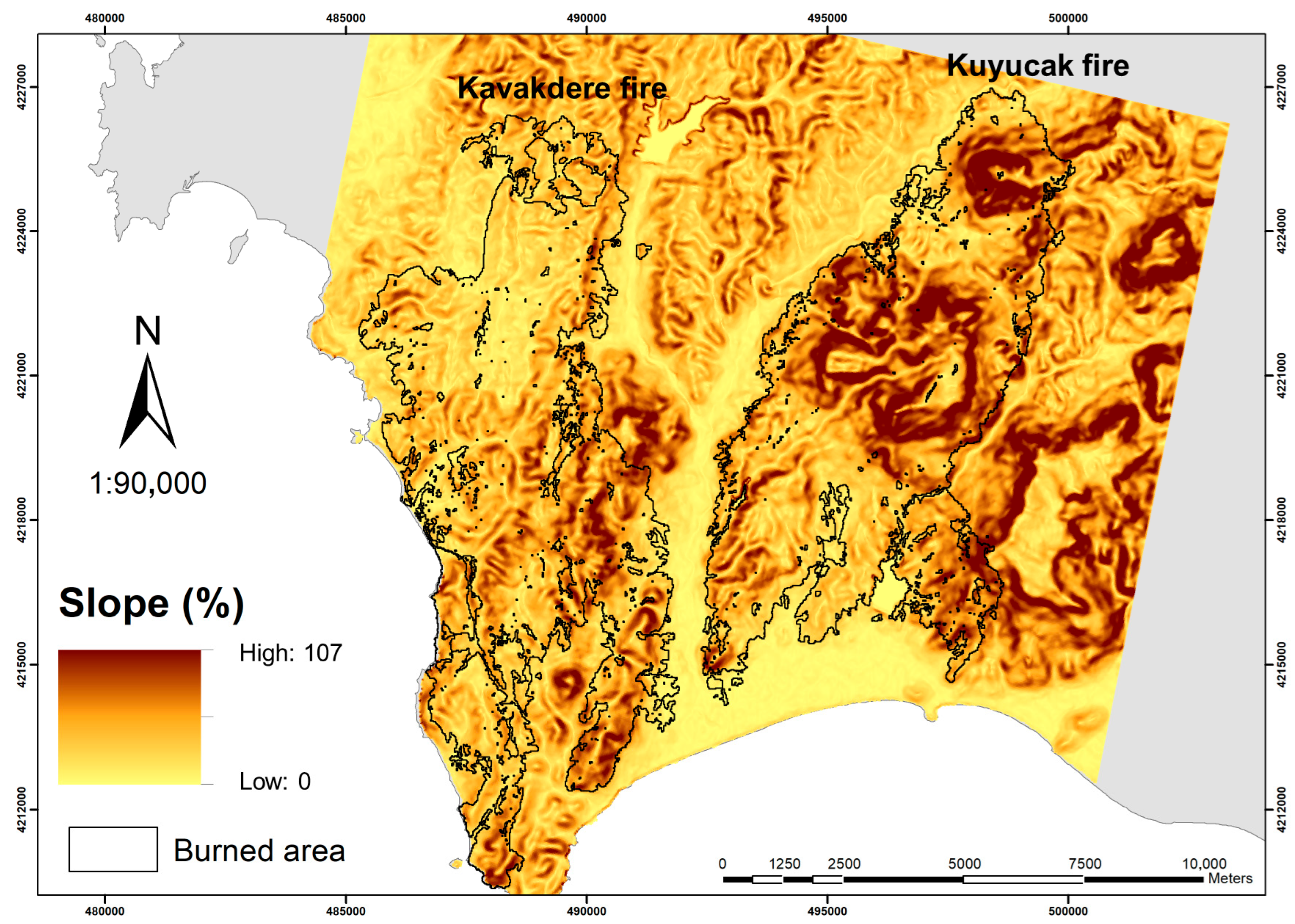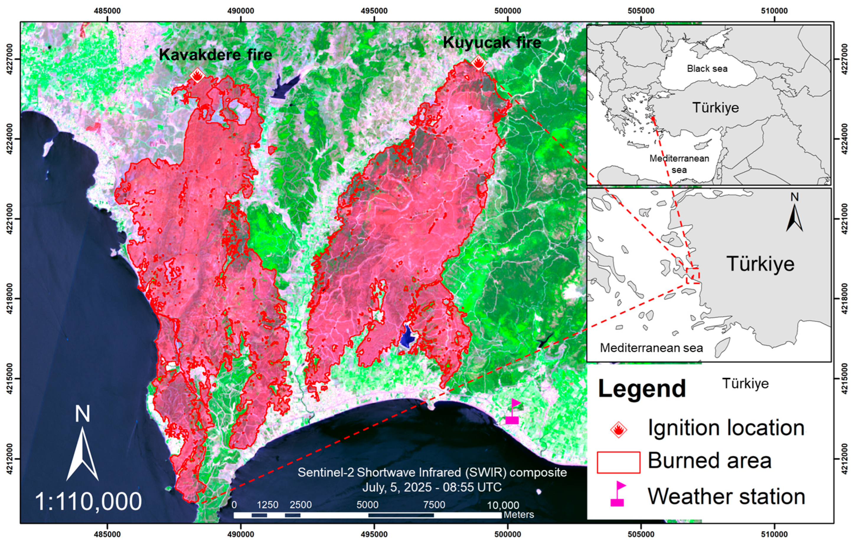 - GDF. Kuyucak Fire Record Sheet; General Directorate of Forestry in Türkiye: Ankara, Turkey, 2025.