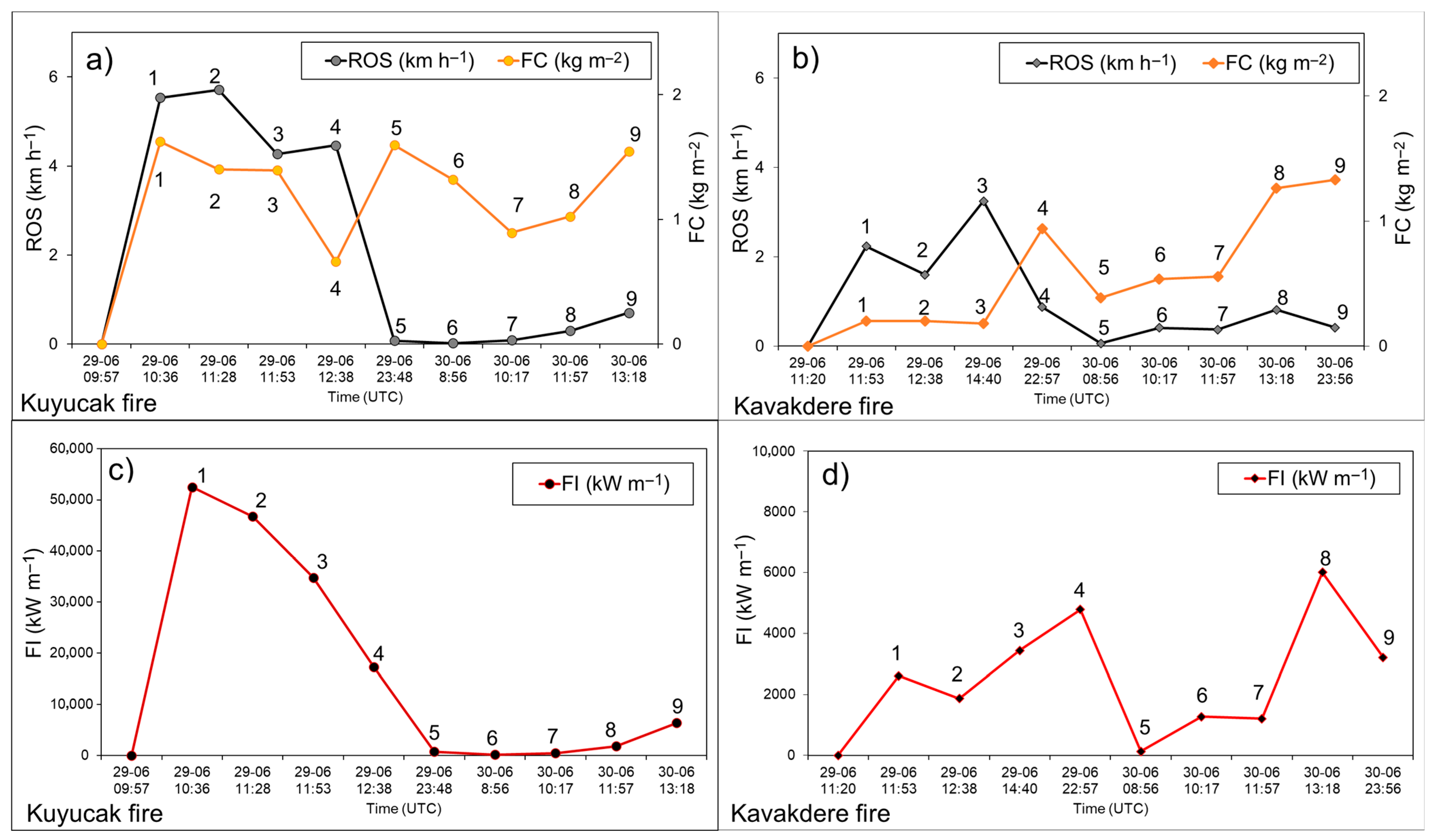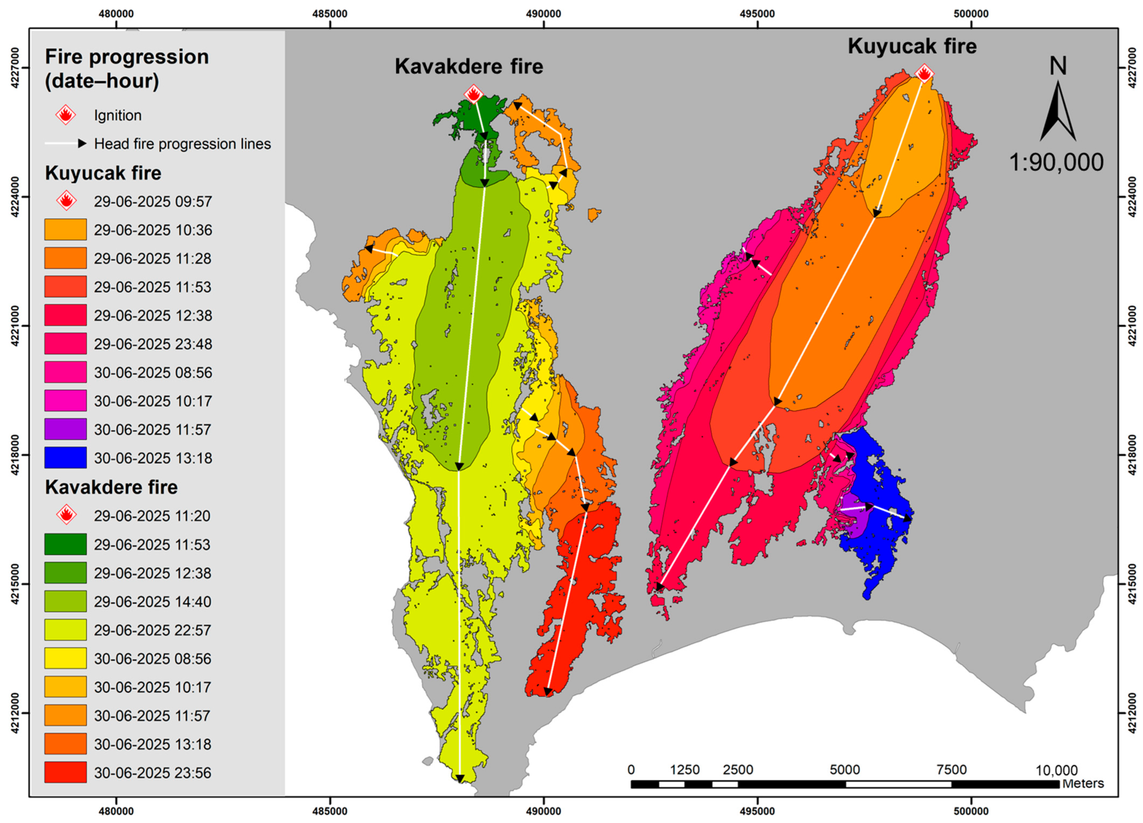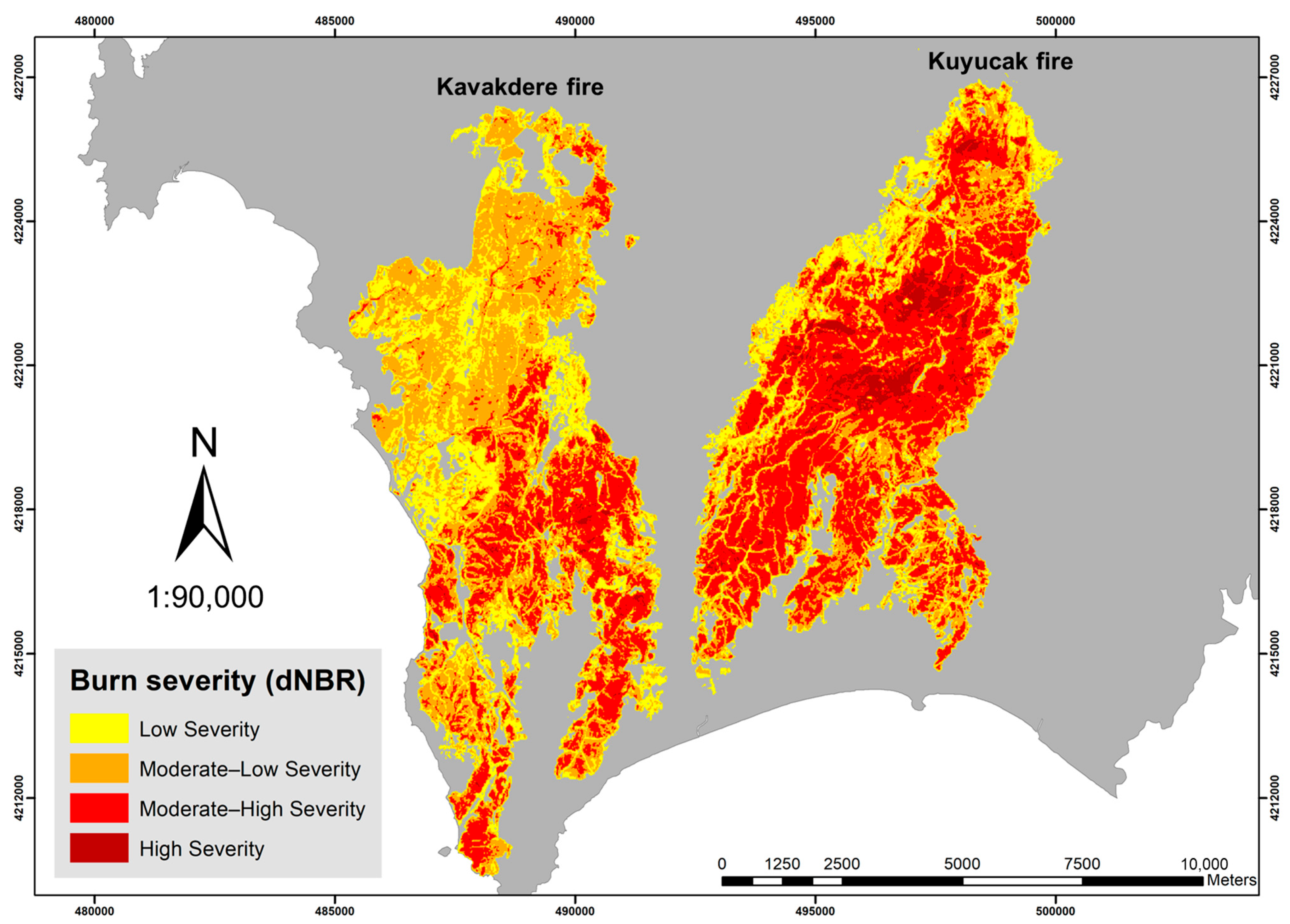 4.2. Differences in Fire Spread and Intensity Between Kuyucak and Kavakdere Fires