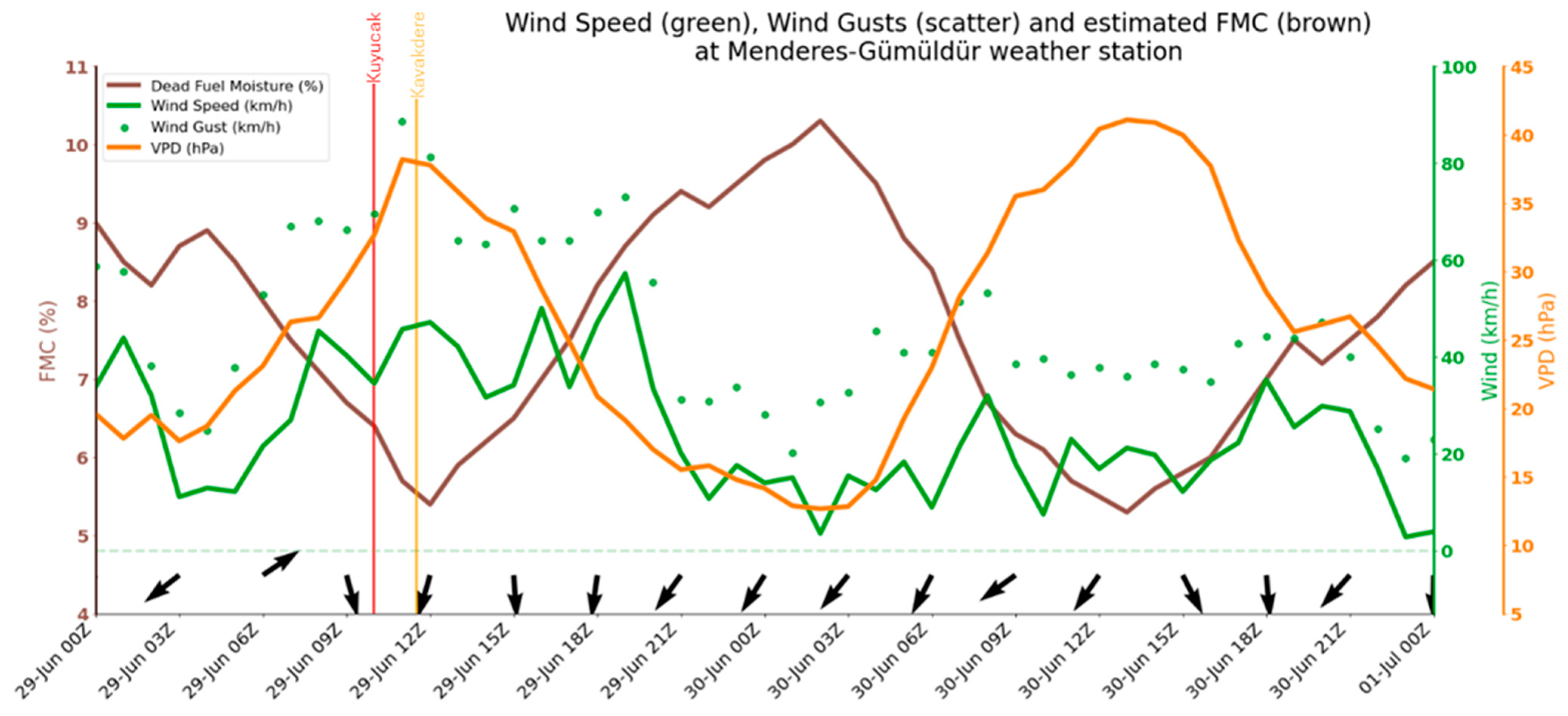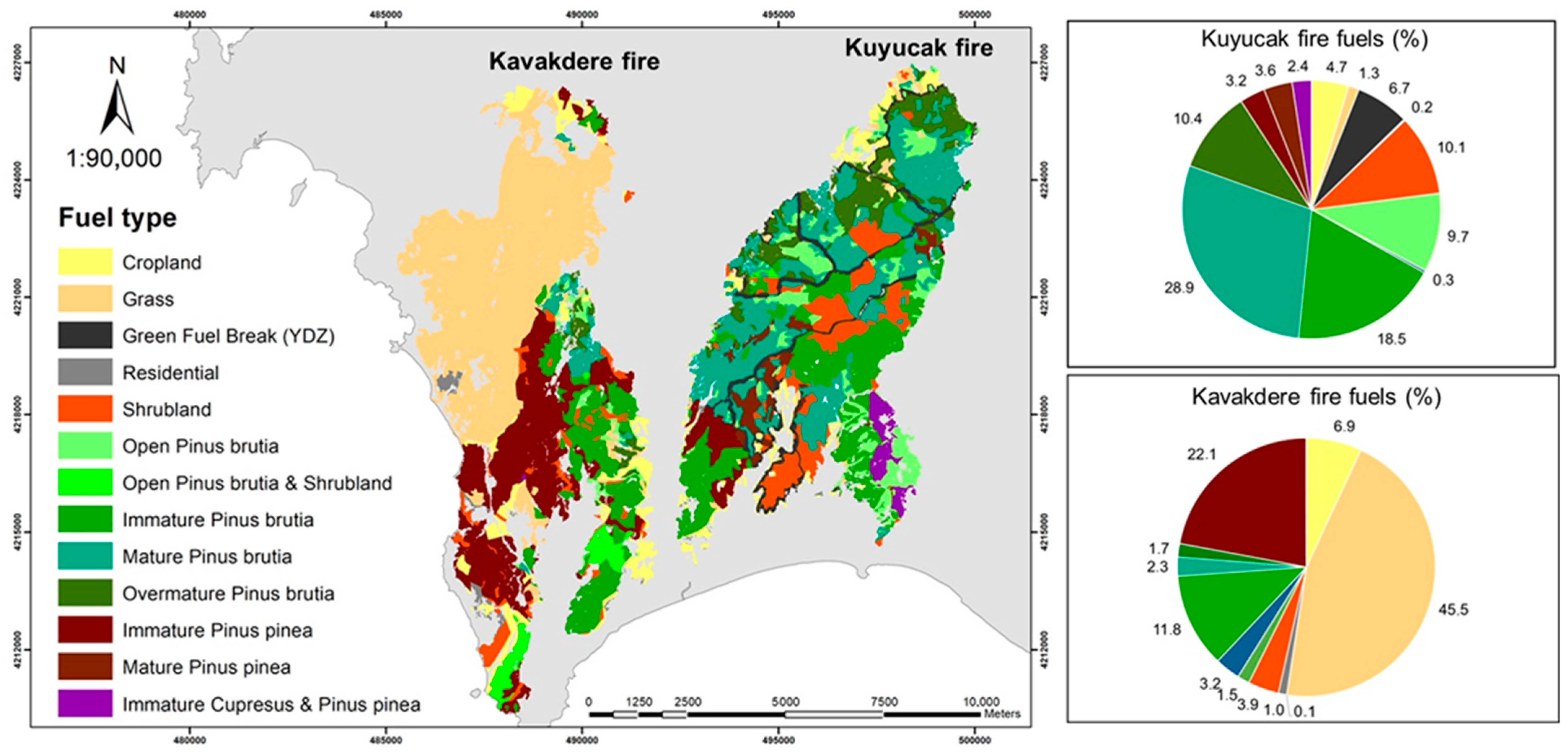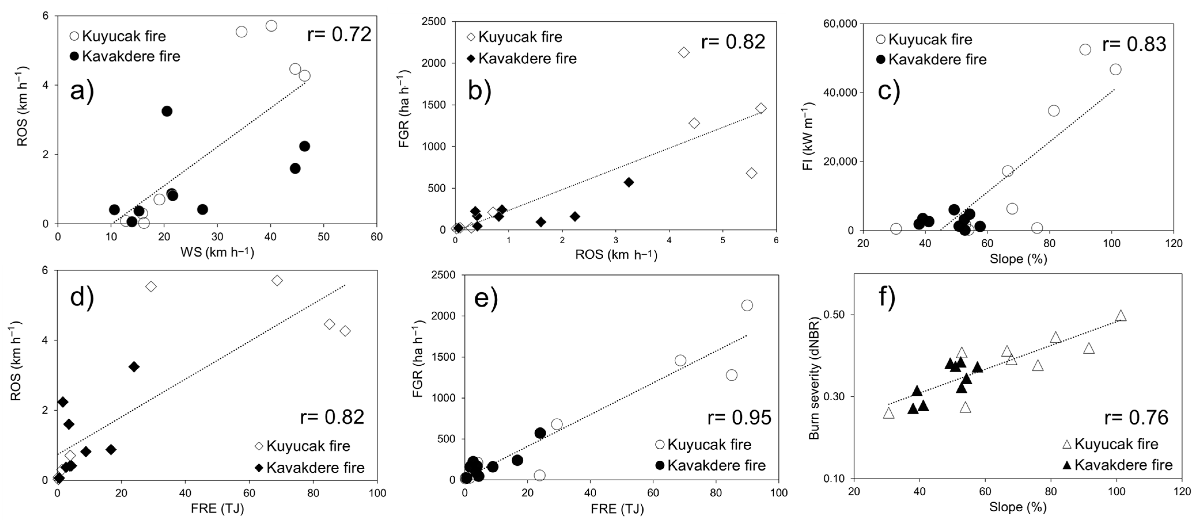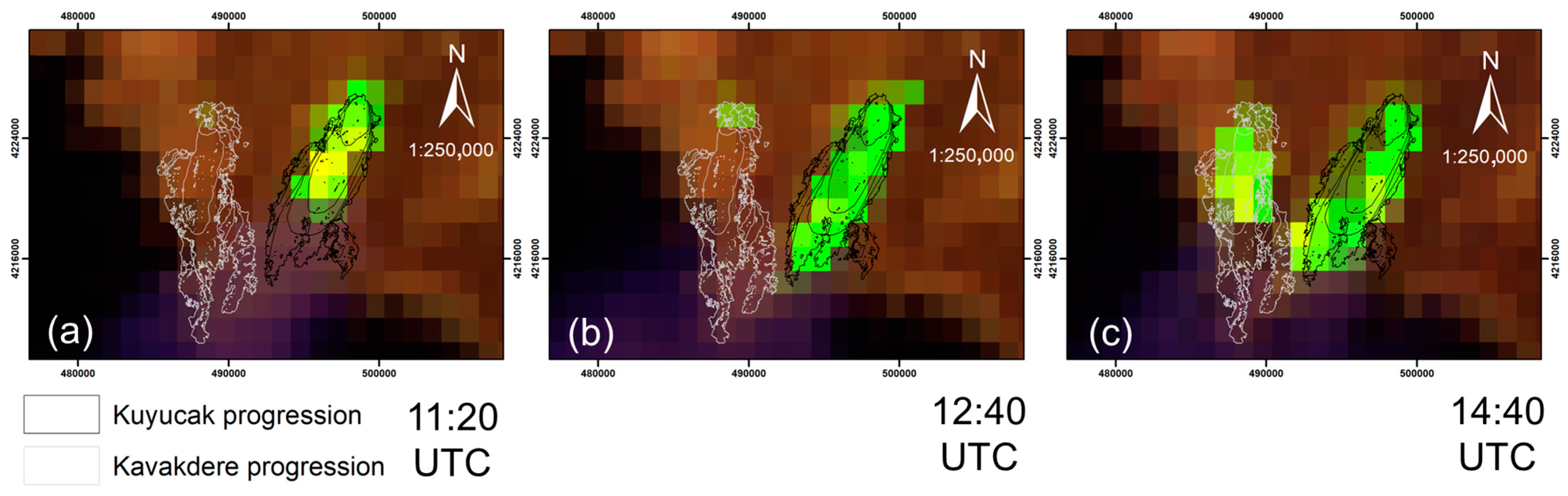4.2. Differences in Fire Spread and Intensity Between Kuyucak and Kavakdere Fires