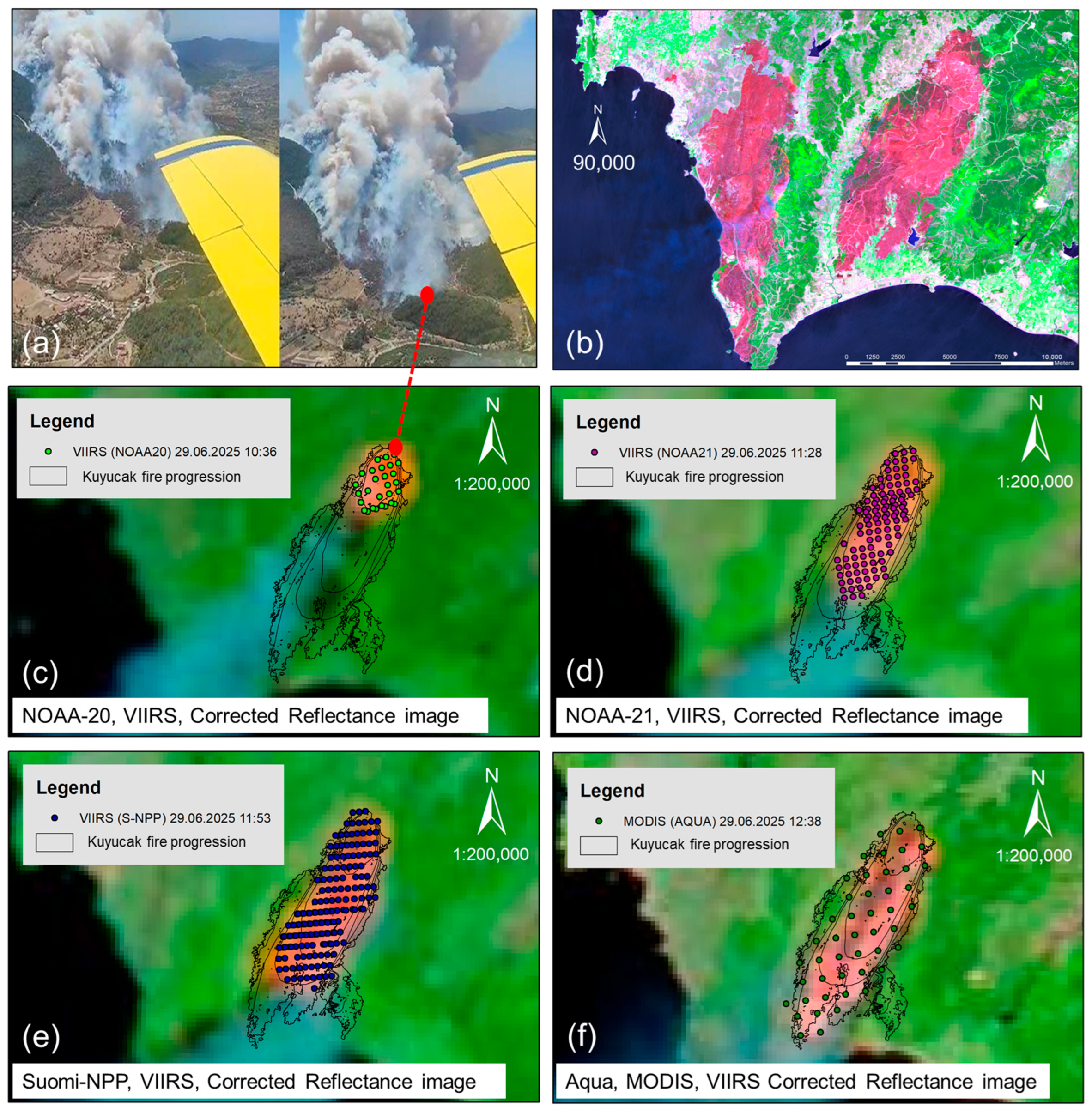 - Coskuner, K.A. Enhanced Wildfire Monitoring: The Importance of Real Time Data Acquisition and Fire Behavior Analysis Using Remote Sensing. In Proceedings of the “Forest Fires—Preparedness and Innovative Technologies”, Istanbul Forest Innovation Week, Istanbul, Türkiye, 20–25 October 2025. [Google Scholar]