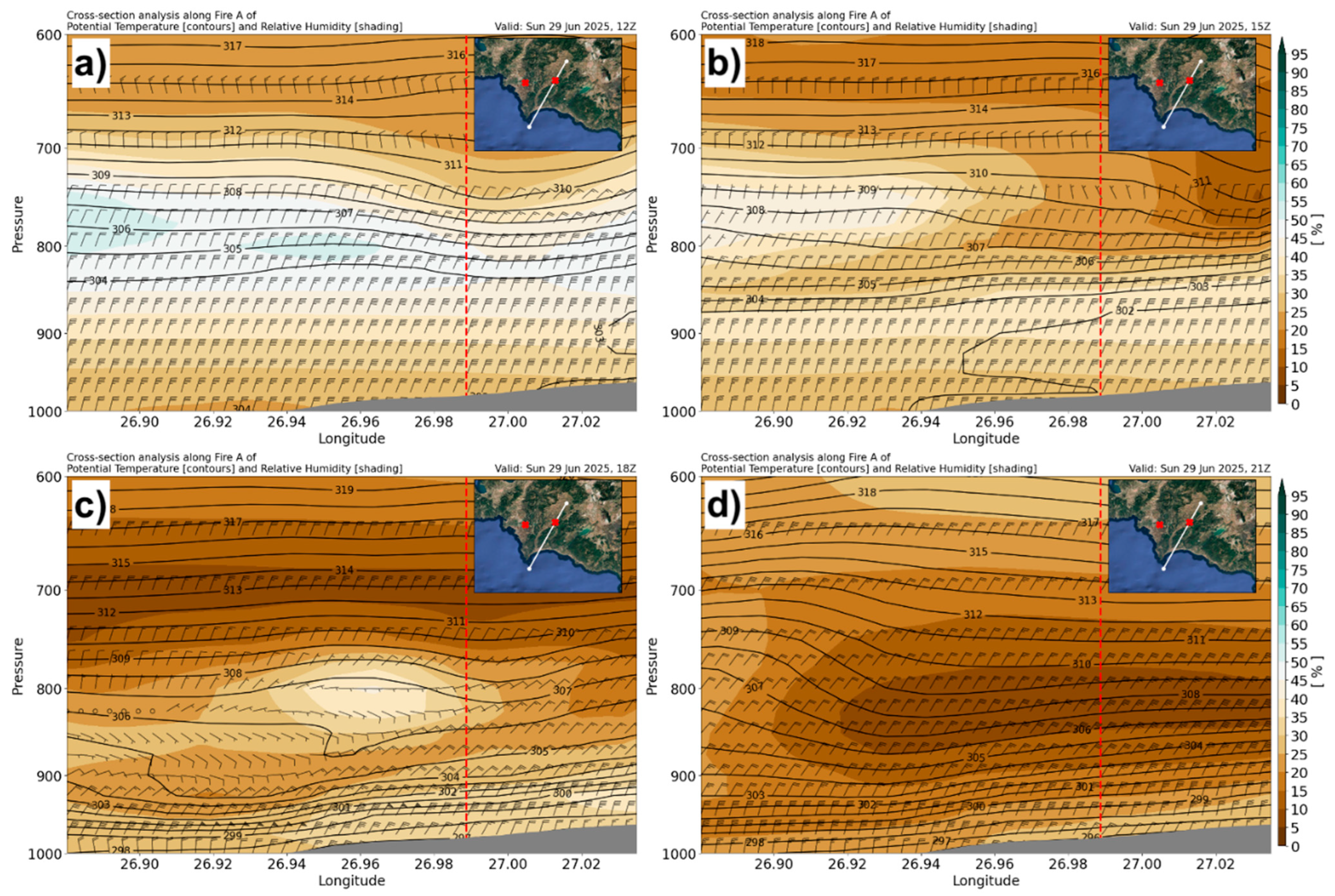 - Purificação, C.; Santos, F.L.M.; Henkes, A.; Kartsios, S.; Couto, F.T. Fire-weather conditions during two fires in Southern Portugal: Meteorology, Orography, and Fuel Characteristics. Model. Earth Syst. Environ. 2025, 11, 135. [Google Scholar] [CrossRef]