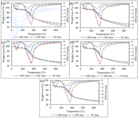 (a) 5 mL min−1 TGA-DTG, (b) 10 mL min−1 TGA-DTG, (c) 20 mL min−1 TGA-DTG, (d) 30 mL min−1 TGA-DTG, (e) 40 mL min−1 TGA-DTG.
