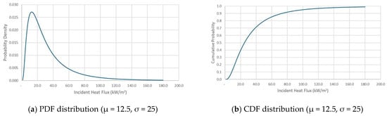 A lognormal distribution with a mode of 12.5 kW/m2 and a median of 25 kW/m2 (i.e., 50% of cases have IHF below 25 kW/m2) was adopted for the incident heat flux (IHF) from UHSs. The modal value was selected to represent a moderate unintended heat exposure level in the absence of comprehensive statistical data. Figure 1 illustrates the corresponding probability density function (PDF) and cumulative distribution function (CDF) of the assumed IHF distribution.