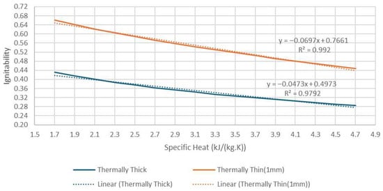 For PMMA, density and thermal conductivity are relatively constant, but temperature-dependent specific heat ranges from 1 to 10 kJ/(kg·K) [28], causing an order-of-magnitude variation in thermal inertia. Figure 6 shows that ignitability varies almost linearly with specific heat. Notably, thermally thin materials are more sensitive to changes in specific heat than thermally thick materials.