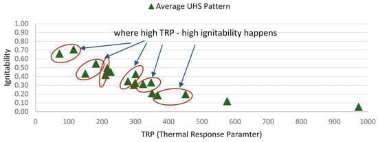On one hand, the first three RMSE values reveal the similarity of ignitability ranks between the three UHS patterns. Materials with different ignitability ranks from the average UHS pattern show very close ignitability, like acrylic vs. FR Plywood, and Expanded PS40 vs. Asphalt Shingle. On the other hand, the much larger RMSE from TRP ranks and Figure 7 suggest that although in general the ignitability decreases with the increase in the TRP, there are some local cases where materials with higher TRP exhibit higher ignitability within the selected UHS assumptions. For example, as shown in Figure 7, there are some materials that have both higher TRP and higher ignitability, which deviates from the common interpretation that a higher TRP implies lower ignitability. The reason for this mismatch partly arises from the neglect of surface heat losses in the simplified TRP expression, since when the ignition temperature of a material is high, surface heat loss (especially through reradiation) becomes more significant. This can be confirmed by comparing the material of rigid foam plastic and Extrued PS40 in Table 1: the former one has a lower TRP (71.8801) than the latter (113.7540), but its ignition temperature (435 °C) is much higher than that of Extruded PS40 (275 °C), which leads to a higher surface heat loss and thus a lower ignitability under the UHS-based evaluation.