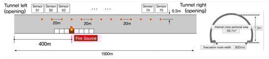 This study aims to predict fire spread inside a tunnel. CFD simulations are conducted in a tunnel with a length of 1500 m and a height of 7.5 m (Figure 1). A total of 75 sensors is placed at a height of 7 m along the tunnel at 20 m intervals, and each sensor records temperature, soot concentration, and CO concentration over time. The simulations cover various fire sources, fire locations, and fire cases. The fire cases are defined by all combinations of three heat release rates and three growth rates, resulting in nine scenarios in total. The heat release rates are 5, 10, and 20 MW (Megawatt), and the growth rates are standard, medium, and fast. For example, one case corresponds to a fire with a heat release rate of 5 MW and a medium growth rate. A summary of all fire cases is provided in Table 1.