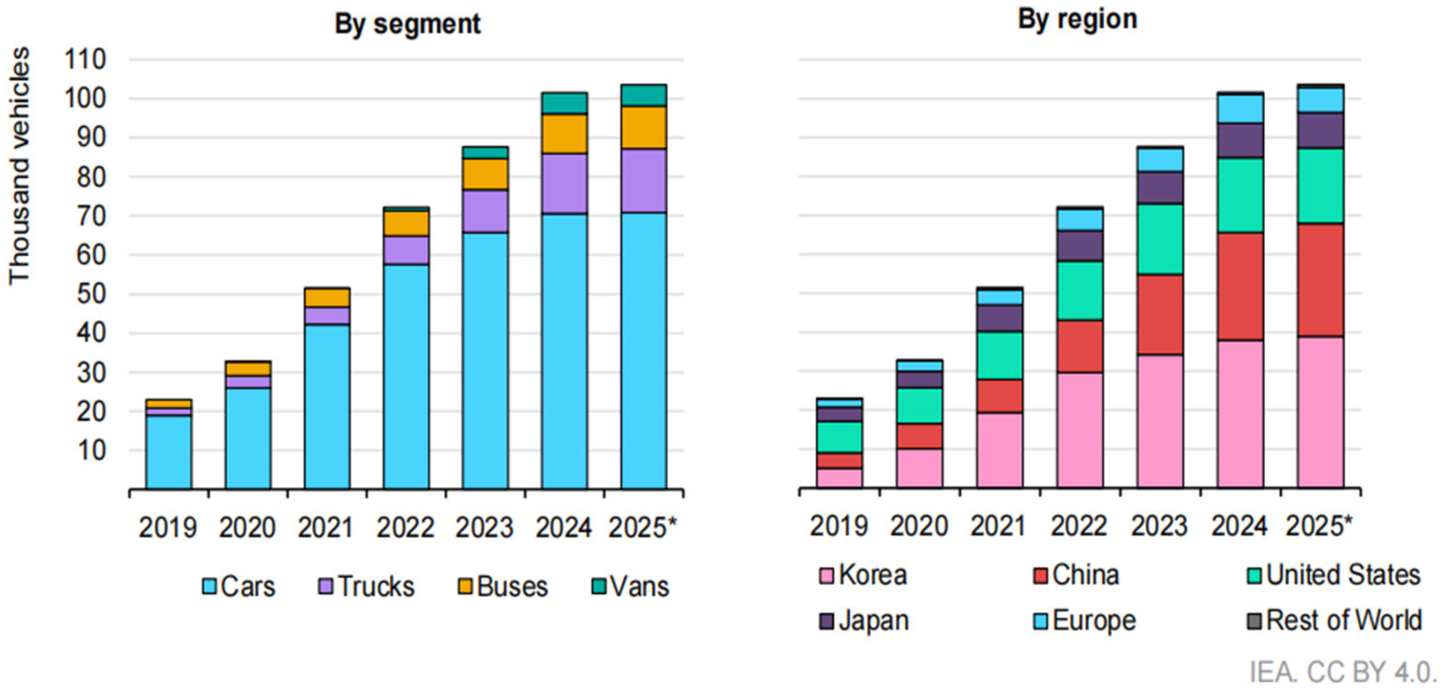 Figure 1, the figure illustrates the changing trends in the stock of fuel cell electric vehicles globally and across different regions from 2019 to 2025. Based on data from the International Energy Agency (IEA) Hydrogen Infrastructure Projects database (September 2025), the chart clearly reveals a significant growth in the global deployment and adoption of fuel cell vehicles. With the increasing prevalence of fuel cell vehicle usage, safety concerns related to the vehicles and their surrounding environments are drawing greater attention [