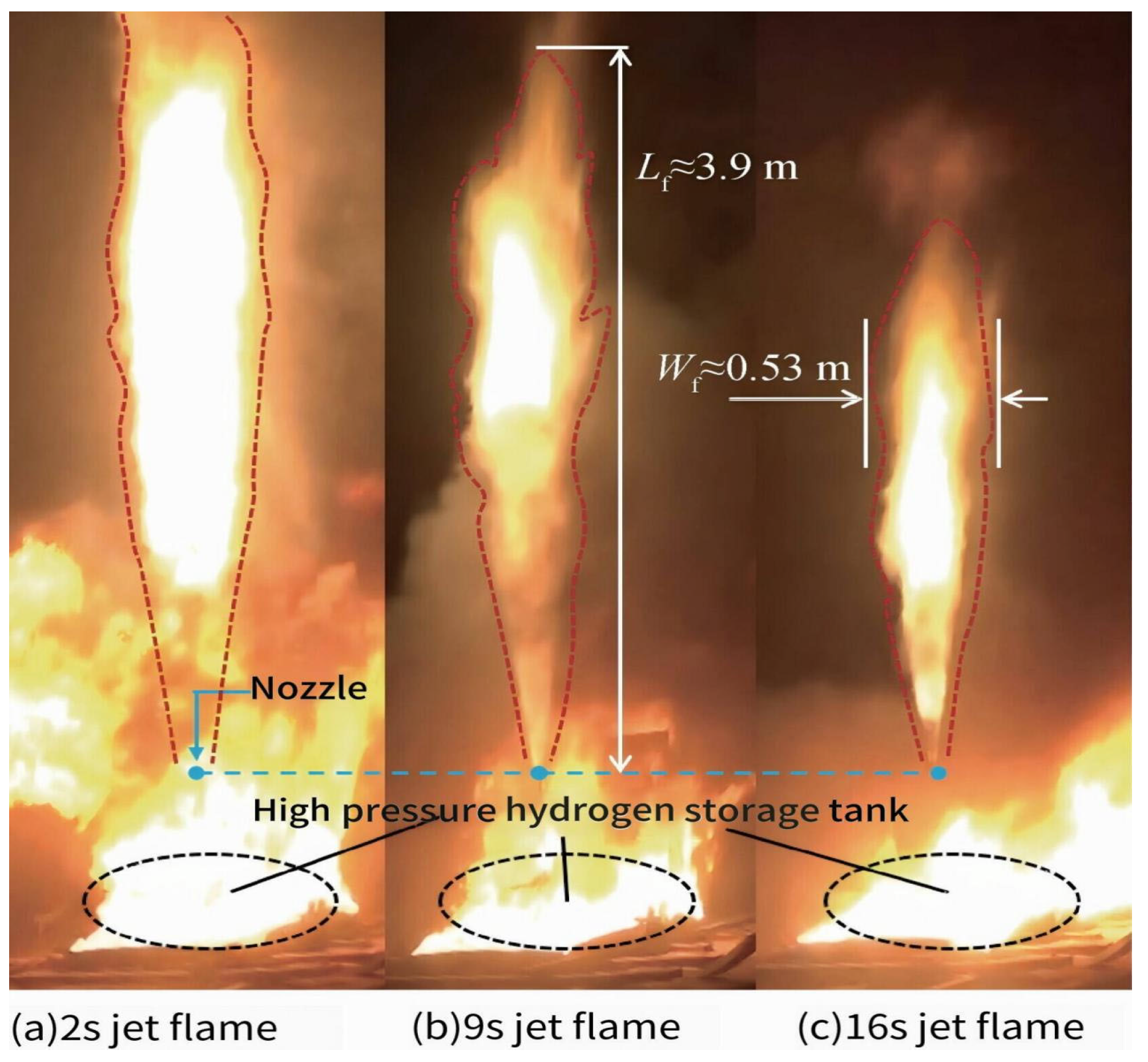 3]. Specifically, the rapid increase in the vehicle fleet directly raises the probability of high-pressure hydrogen storage system leaks occurring both in static states (e.g., while parked in lots or service centers) and during operation. Consequently, the accurate prediction of jet flame length—the most hazardous consequence of high-pressure hydrogen leakage—has become a critical research topic for ensuring the safe and sustainable development of the industry, holding vital practical significance.