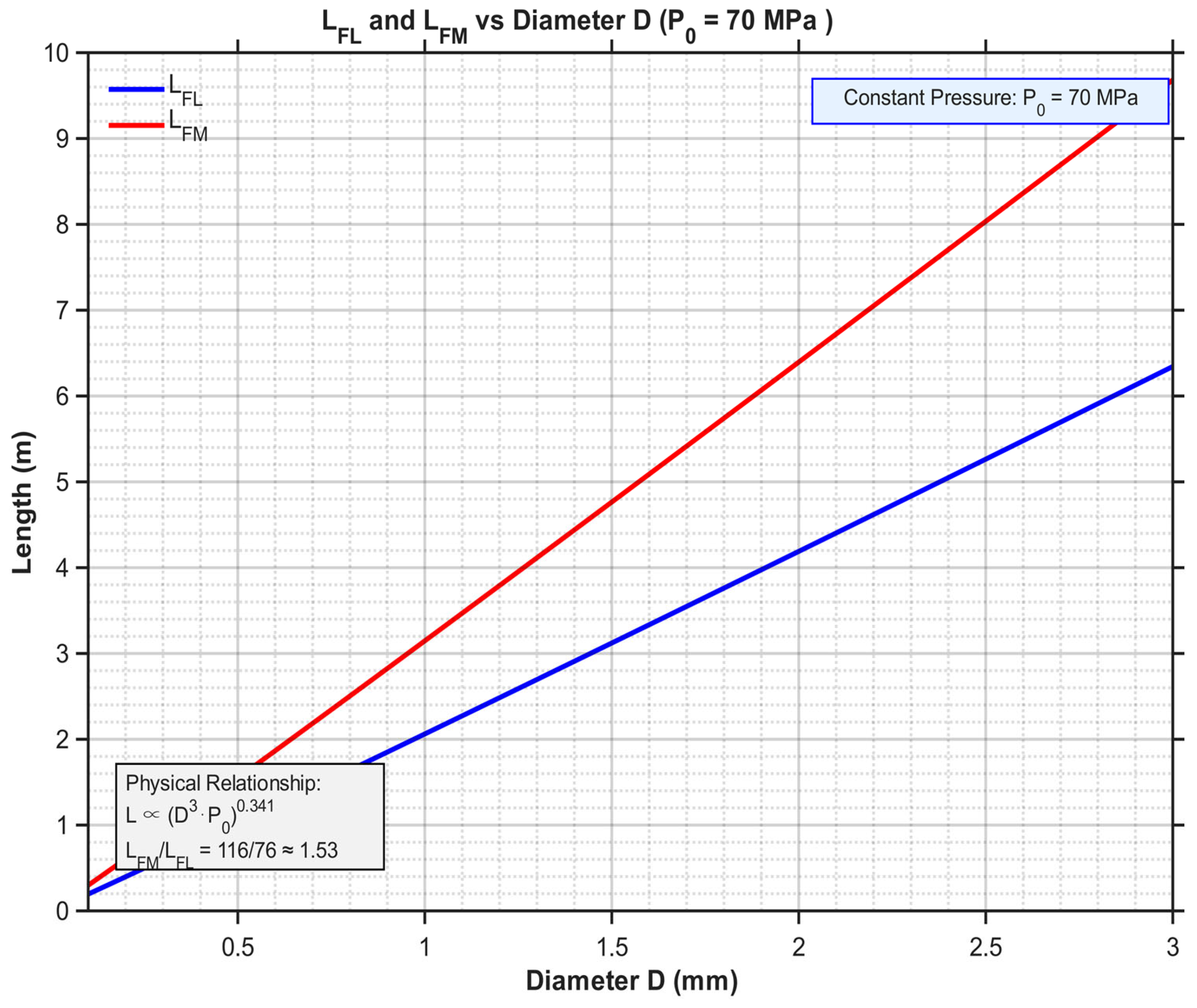Flame length is closely related to the fuel mass flow rate, typically following a power-law relationship. Therefore, the pattern of mass flow rate variation with diameter revealed in this figure directly dictates the corresponding trend of flame length with diameter. It can be unequivocally stated that since the mass flow rate increases with , the flame length is expected to increase approximately linearly with (or a power of ). This establishes a clear logical bridge for the subsequent parametric investigation.