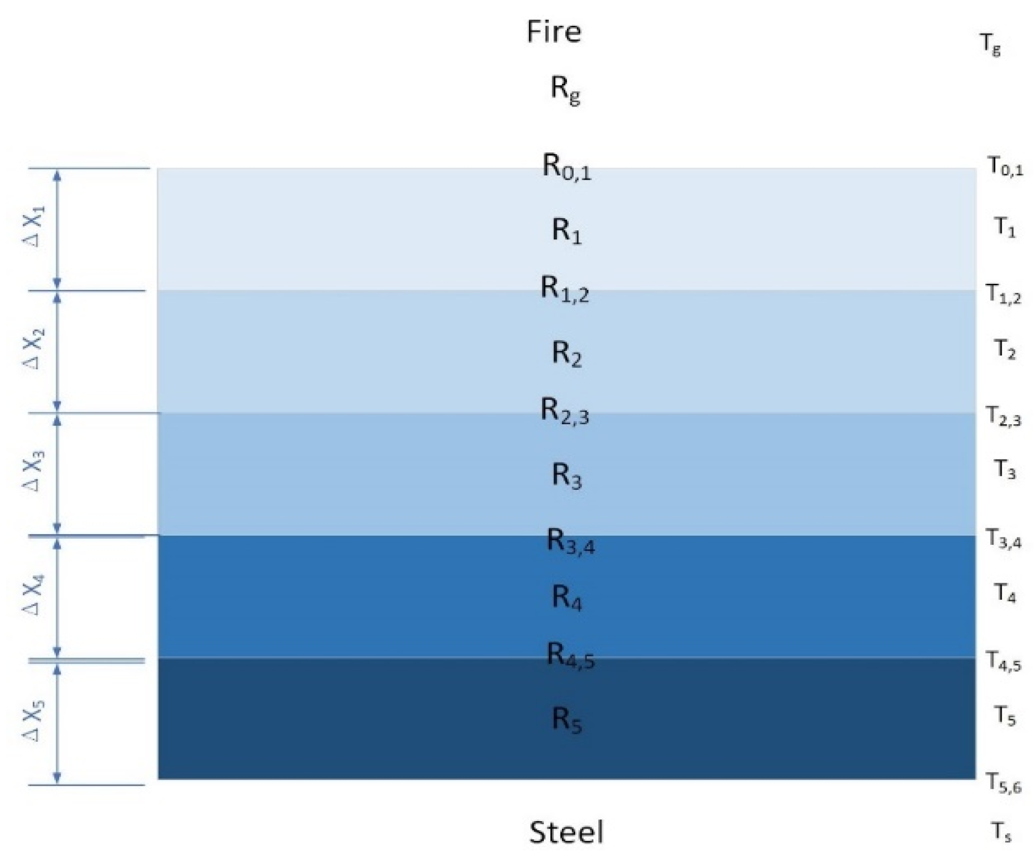 The structural steel temperature in the multi-layer model is calculated slightly differently from the single-layer model. The thermal resistances are summed together to form an overall thermal resistance, as shown in Equation (29). This overall thermal resistance replaces the