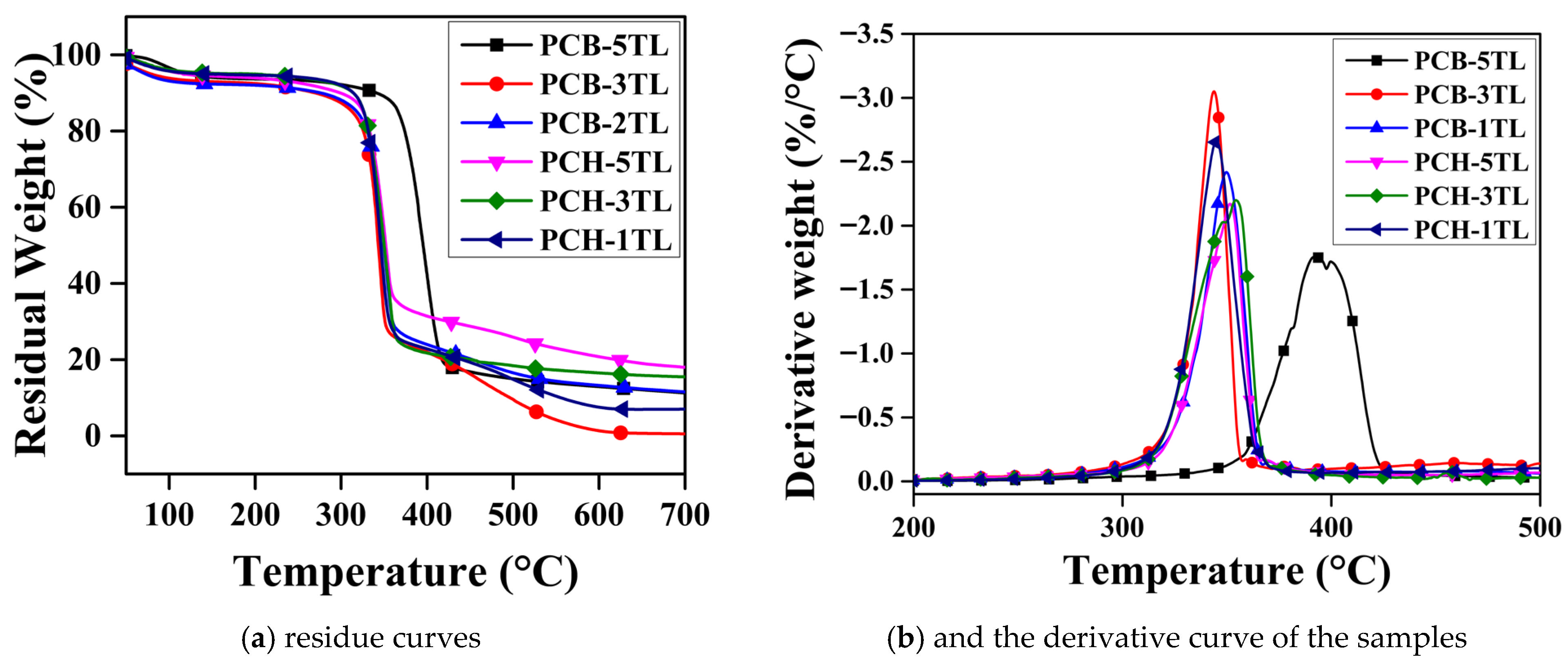 | Samples | Tp, °C (DTG Peak) | Residue at 700 °C (%) | Total Decom (%) |