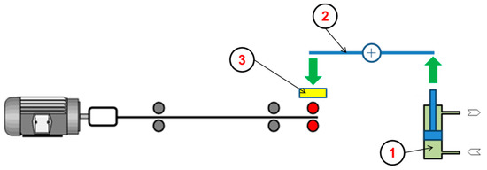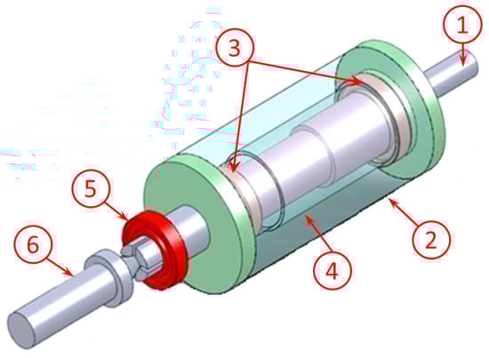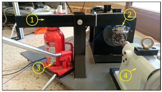 As shown in Figure 4, the loading function’s primary role was to apply a radial load on the test bearing. It consisted of a hydraulic jack (1), a lever (2), and a load cell (3).