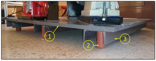 Support base system: (1) 1 m × 1 m × 2 cm supporting plate; (2) 6× anti-vibration rubber pads; (3) 3× U-shaped steel beams.