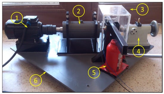The manufactured test rig with a protective box: (1) motor; (2) housing; (3) protection cover; (4) tailstock; (5) hydraulic jack; (6) base.