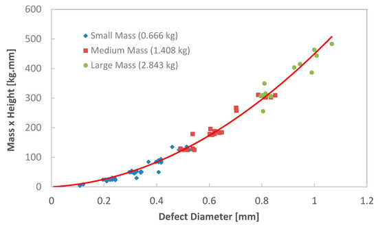 To control the size of the seeded defects, the relationship between the mass value, its drop height, and the defect size needed to be understood beforehand. Therefore, to fit correctly inside the device, three different masses were manufactured (0.666 kg, 1.408 kg, and 2.843 kg). Each one of these masses had to be dropped from various heights. The combination of all previous masses, together with their drop heights, permitted us to generate the calibration curve displayed in Figure 10.