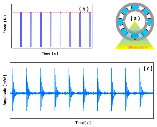 When a defect is found on the outer ring of a bearing, and that particular ring is stationary, the defect will be located inside the stress zone the entire time (Figure 13a). When balls roll across defects of this type, they will produce a set of impulsive forces with equal amplitudes (Figure 13b). Consequently, the waveform of the vibration response will be repeated identically each time the ball strikes the defect (Figure 13c). This cyclic signature could be used to pinpoint the location of faults on a fixed ring of a damaged bearing.