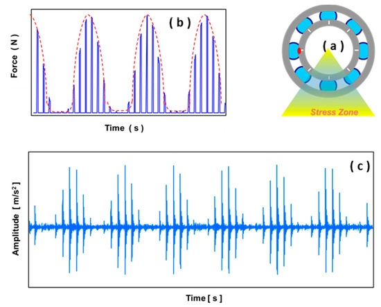 When the defect is located on the inner ring, and that specific ring is rotating, the defect will be moving episodically in and out of the stress zone (Figure 14a). Consequently, the point at which the rolling elements encounter the defect will keep moving from one position to another, and the resulting impact forces will be modulated (Figure 14b). Because of this, the time waveform will also be modulated (Figure 14c).