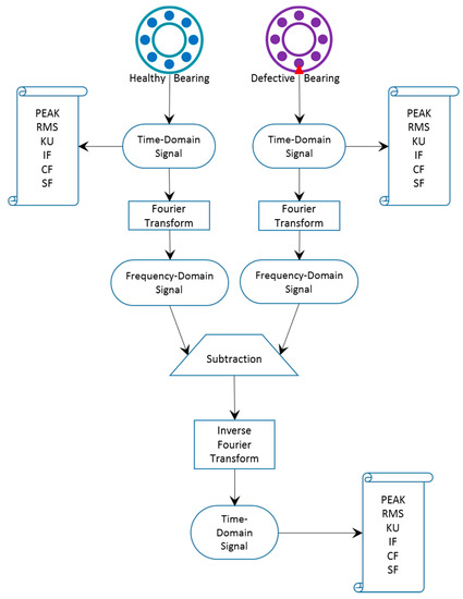 The principles and procedures of the analytical methodology are depicted in Figure 15. First, a healthy bearing free from any surface defects was mounted on the test rig, and its vibration signals were acquired, analyzed, and stored. The time domain parameters extracted from the healthy bearing’s vibration data served as a reference for further signal processing efforts. Next, the healthy bearing was removed and replaced on the test rig by a defective one. Again, the time-domain parameters were recorded and analyzed. Since the vibration signal emanating from the bearing passes through the machine to reach the sensor, it is evident that the contribution of the machine, with all its imperfections, will be visible in all the measurements, regardless of whether the test bearings installed on the rig are healthy or damaged. The ability of the statistical time-domain parameters to detect or quantify bearings faults would lack accuracy because such parameters are likely to be strongly influenced by non-bearing faults such as electrical problems, shaft imbalances, pitting on the gear tooth, or misalignment. In particular, when the defect is newly created, its vibration pattern may not be precisely identifiable among all the inputs generated by the neighboring mechanical components. To enhance the visibility of the bearing’s vibrations, the disturbing effect of the machine should be canceled, if possible, or minimized, at the very least. This aim could be achieved by performing a spectral subtraction between the first spectrum collected from the machine holding a healthy bearing, and a second spectrum from the same machine but with a defective bearing. Of course the previously mentioned subtraction would be possible only in the frequency-domain, again because all the frequency components are distinct in that case. The result of this procedure should theoretically cancel or reduce the effect of the hosting environment (present in both spectra) and leave the effect of the damaged bearing alone. Returning back to the time-domain would theoretically generate statistical parameters that are more stable and less sensitive to the machine contribution.