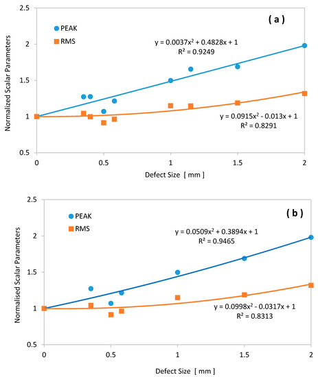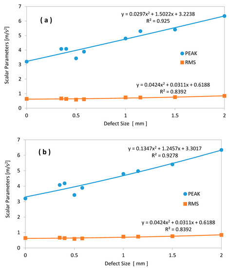 Evolution of normalized PEAK and RMS values: (a) defects on the inner bearing race; (b) defects on the outer bearing race.