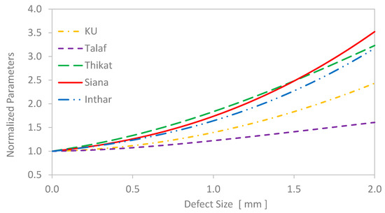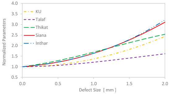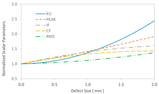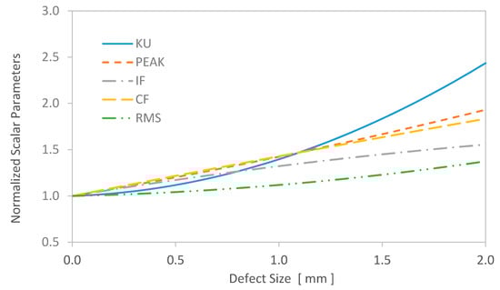 For the case where the defects were located on the outer ring, the changes in the normalized scalar parameters are plotted in Figure 19. This result was again obtained under a specific rotation speed of 800 rpm and an applied load of 0.5 kN.