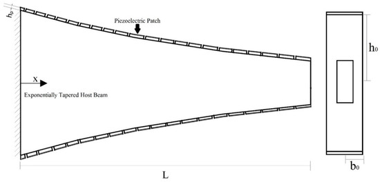 A nonlinearly tapered cantilever beam with a pair of piezoelectric patches symmetrically and perfectly bonded to the top and bottom surfaces of it, side and front views [11].