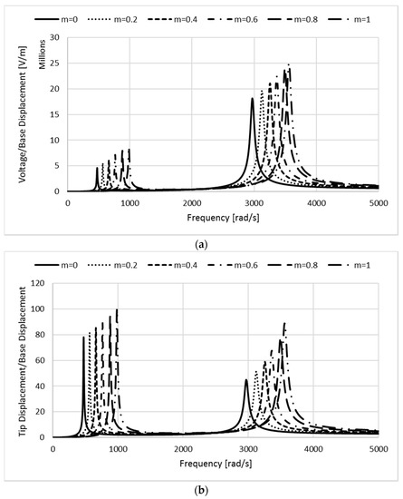 Figure 2a gives the effect of decaying taper geometry on the voltage output in the frequency domain. As shown Figure 2, higher tapering nonlinearity of the harvester leads to significant rise of the voltage output. By changing the taper ratio from 0 to 1, the peak voltage for the first and second vibration modes shows 1.89 and 1.37 times higher values compared to the uniform configuration. For excitation frequencies around φ = 984 rad/s, the non-uniform piezoelectric energy harvester with same length, volume and material properties but with m = 1 geometrical taper ratio generates up to 51 times higher voltage output than the traditional uniform design, Figure 2a. Furthermore, the nonlinear taper effect on the tip displacement is shown in Figure 2b. The nonlinear decaying profile of the piezoelectric energy harvester has a substantial positive effect on the electromechanical outputs [11].