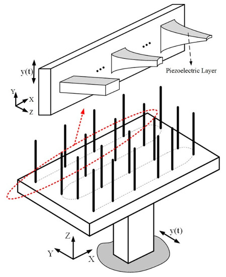 In this section, the probability of designing a wideband energy harvesting system from an array of non-uniform cantilever bimorphs is investigated. The basic idea of an ensemble of the beam-mass structure is borrowed from Ref. [13] and further developed. An energy harvesting system including several nonlinearly tapered piezoelectric-coupled cantilever beams, each of which has the same volume and length but different taper ratios and hence different resonance frequencies, is considered. A schematic illustration of the proposed wideband energy harvester configuration is shown in Figure 3.