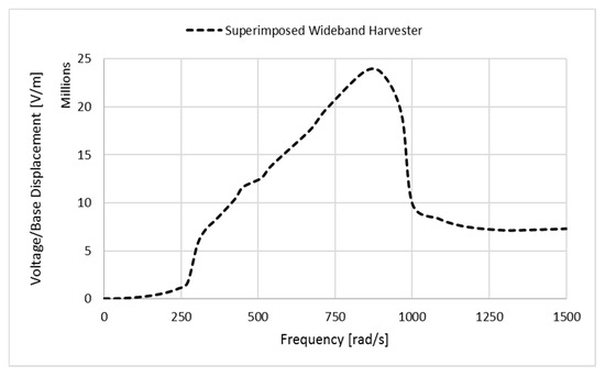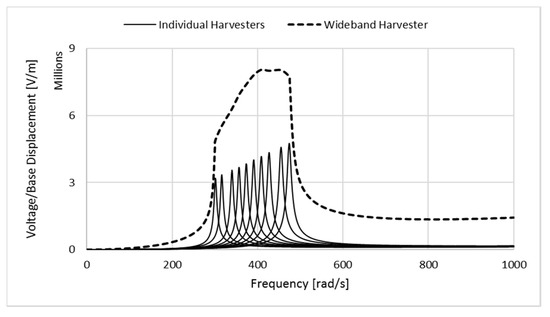 In this design, the geometrical variation function is the decaying exponential one like what was presented in Section 3. The geometrical taper ratio increments are chosen as 0.05. The electromechanical outputs of a wideband energy harvesting system including 20 non-uniform bimorph cantilevers with the same length, volume, and mass are presented in Figure 4. As depicted, a slight difference in the geometry of the non-uniform harvester can lead to a considerable alteration in the natural frequencies and electromechanical outputs. In fact, steeper nonlinearity in the geometry of the structure results in higher natural frequencies and peak voltage outputs. Figure 4 shows the estimated voltage output of the wideband energy harvesting system within an input excitation range of [𝜔min–𝜔max] = (475–965) rad/s ≈ (75–155) Hz. The bottom plots show the individual output of each harvester whereas the top plot displays the superimposed overall voltage. As shown in Figure 4, high peak voltage outputs (>10 V) at resonance can be obtained in a wide frequency range from 500 rad/s to 950 rad/s by employing 20 nonlinearly tapered cantilever harvesters. Increasing the excitation frequency leads to higher peak voltage output (10 V to 22 V) due to the higher natural frequencies and peak voltage outputs of the bimorph cantilevers with greater taper ratios in the wideband harvesting system.