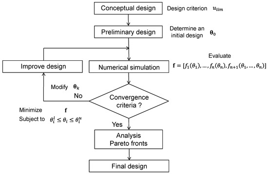 The overall scheme of the proposed motion-based design method for the optimum design of the passive damping devices in order to reduce the wind-induced vibrations in stay cable is shown in Figure 3. First, the optimization problem is defined (the multi-objective function, the design variables and the search domain of each design variable). Subsequently, the preliminary design is determined. As a result, of this step, an initial value of the characteristic parameters (design variables) is obtained. A FE model is built and the dynamic response of the damper-structure interaction model is determined. A first evaluation of the multi-objective function is performed. If the multi-objective function meets the convergence criteria, the final design is obtained. Otherwise, the design variables must be modified, and a new design evaluated. The process is repeated iteratively until the convergence criteria are met. As convergence criteria, the maximum iteration number and the tolerance of the objective function (the optimization algorithm stops if the average relative change in the best evaluation of the objective function is less than or equal to the function tolerance) are considered herein. Subsequently, the different Pareto fronts are defined, and the optimal solution is obtained via both the analysis of the Pareto fronts and the application of the additional condition.