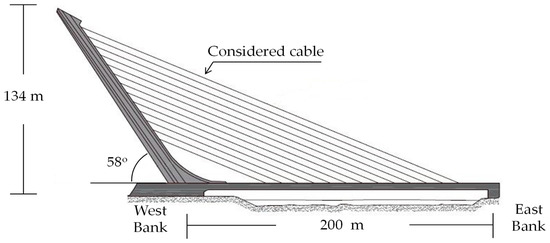 The deck of the cable-stayed bridge has a total length of 200 m, characterized by the absence of back-stays. Instead, the balance of forces is achieved through the inclination of the pylon of 32° to the vertical [45]. The pylon is connected to the deck by 13 pairs of stays separated by 12 m (Figure 4).