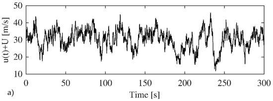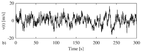 One simulation of the longitudinal, , and the transverse, , components of the wind velocity respectively, obtained via the application of the wave superposition spectral-based method [28,29], at point are shown in Figure 6a,b. In the case of the longitudinal direction, the mean wind velocity, , has been added.