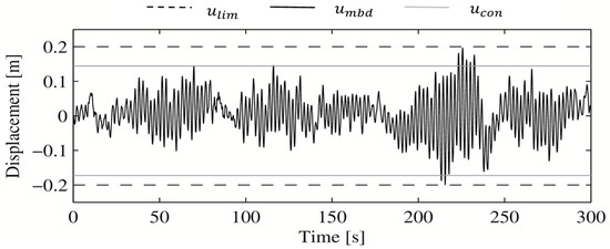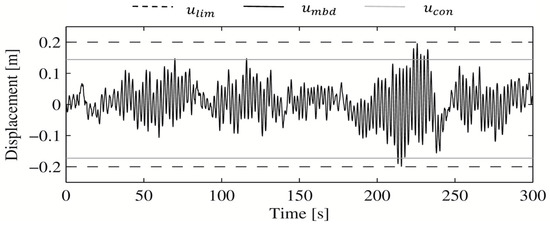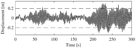 Figure 12 shows the displacement at the mid-span of the cable with the elastomeric damper designed according to the motion-based design method, (the most unfavorable simulation). Additionally, both the maximum displacement at the mid-span of the cable with the viscous damper designed according to the conventional design method [16], , and the design criterion, , were also included as references.