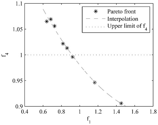 As a result of this problem, the value of the design variable, , was obtained. Figure 9 shows the Pareto front of the multi-objective function, , where the relation between and is illustrated. The limit of the additional condition, , has also been included as reference (upper limit of ). The points of the Pareto front may be fitted by a second-order polynomial (Figure 9). The optimal value of the design variable obtained was, sN/m.