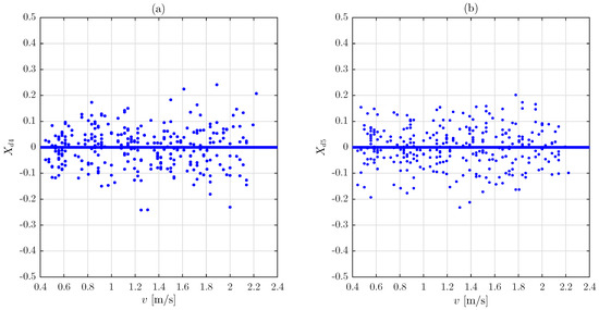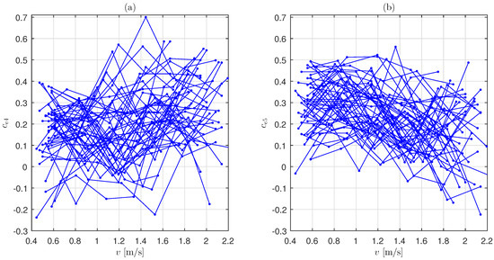 The scattering of these variables seems to be quite uniform in the range of measured speed. Consequently, it is assumed hereafter that the variances of and are speed-independent. Under this assumption, the corresponding variances and were computed from all the experimental realizations. The obtained values were: and .