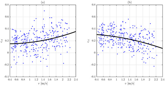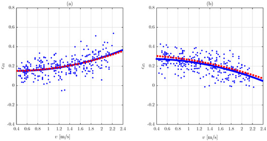 These parameters had a certain global trend: increased with the walking speed, v, while diminished (Figure 1). In addition, there was noticeable trial-to-trial variability for each test subject. Both the trend and the variability of the identified parameters will be studied in turn in the following paragraphs. The trends of these parameters, and , have been modelled by second-order polynomials. The coefficients of the polynomials were estimated through the least-squares method, giving rise to the following values: