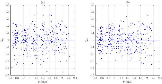 Deviations of the experimental parameters and with respect to their quadratic trends, and , vs walking speed. (a) ; (b) .