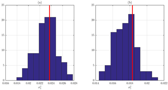 Histogram of the variances of the simulations. Line: experimental value. (a) ; (b) .