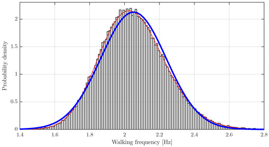The distribution of walking frequency is obtained from that of walking speed in this section. Our model includes the deterministic relationship between both the walking speed and the step interval for a given pedestrian (Equation (3)) and the inter-pedestrian stochastic variability of its parameters (Equation (5)). Therefore, the distribution of the walking frequency can be determined from that of the walking speed through the model. The distributions of the walking frequency corresponding to the three considered distributions of walking speed were achieved from Monte Carlo numerical simulations. For this purpose, 100,000 values of the average step interval, , were computed through the first four items of the procedure in Section 4 for each distribution of walking speed. The corresponding average walking frequencies, , were calculated from them, . The statistical analysis proved that a log-normal distribution fit the results better than a normal distribution, as is shown in Figure 8. The mean and standard deviation of the walking frequency, and , were estimated from the results by the maximum likelihood method considering a log-normal distribution. Outcomes are shown in Table 3 alongside those of the corresponding walking speed. The statistics of the obtained distribution are close to those identified directly from measurements on people walking freely on footbridges and shopping centers in other European countries [14,15]. The walking frequency corresponding to the reference walking speed mean, 1.4 m/s, is 2.05 Hz. The considered increments for the reference walking speed mean, m/s, give rise to frequency increments of Hz.