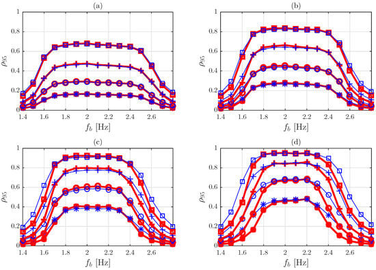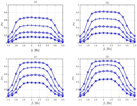 The spectra of the characteristic normalized response were obtained as the envelope of those corresponding to the three mean speeds considered, 1.26, 1.40 and 1.54 m/s. They are depicted in Figure 9. Spectra have a bell-like shape in all the considered configurations, which exhibit a shoulder on the top. The limits of the shoulders vary approximately from 1.7–2.5 Hz for m to 1.8–2.3 Hz for m. These ranges correspond to the central part of the considered walking frequency distributions (Table 3). The limits have a value approximately equal to . Spectra are almost constant in this part. Outside this central part, i.e., in the tails of the frequency distributions, the characteristic response tends progressively to zero.