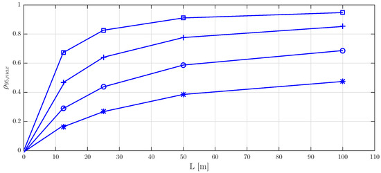 Maximum discrepancy between spectra B and A versus footbridge length, L. Marks: *: , ∘: , +: and □: .